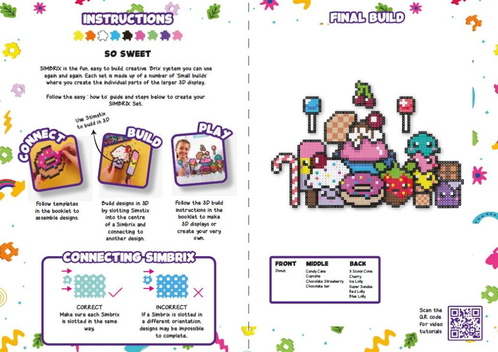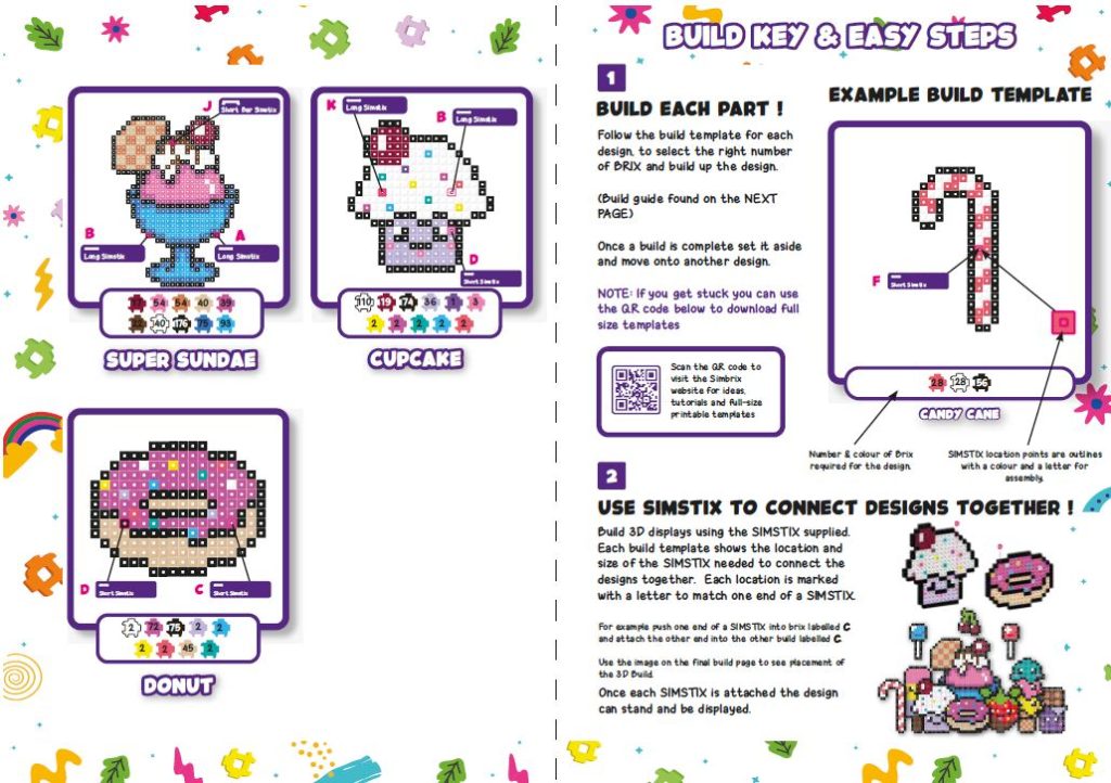 Its sweets and treats galore in this wonderful fantasy land of sugar, spice and all things nice! Explore a delightful dash of doughnuts, luscious lollies, captivating cupcakes all nestling among tempting ices and sugar candy. With over 2500 Brix, this mega set of 12 mini builds can be combined into a tasty looking feast of fun. Each piece is part of a 3D super sweet display.