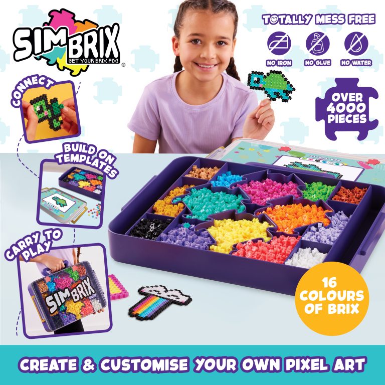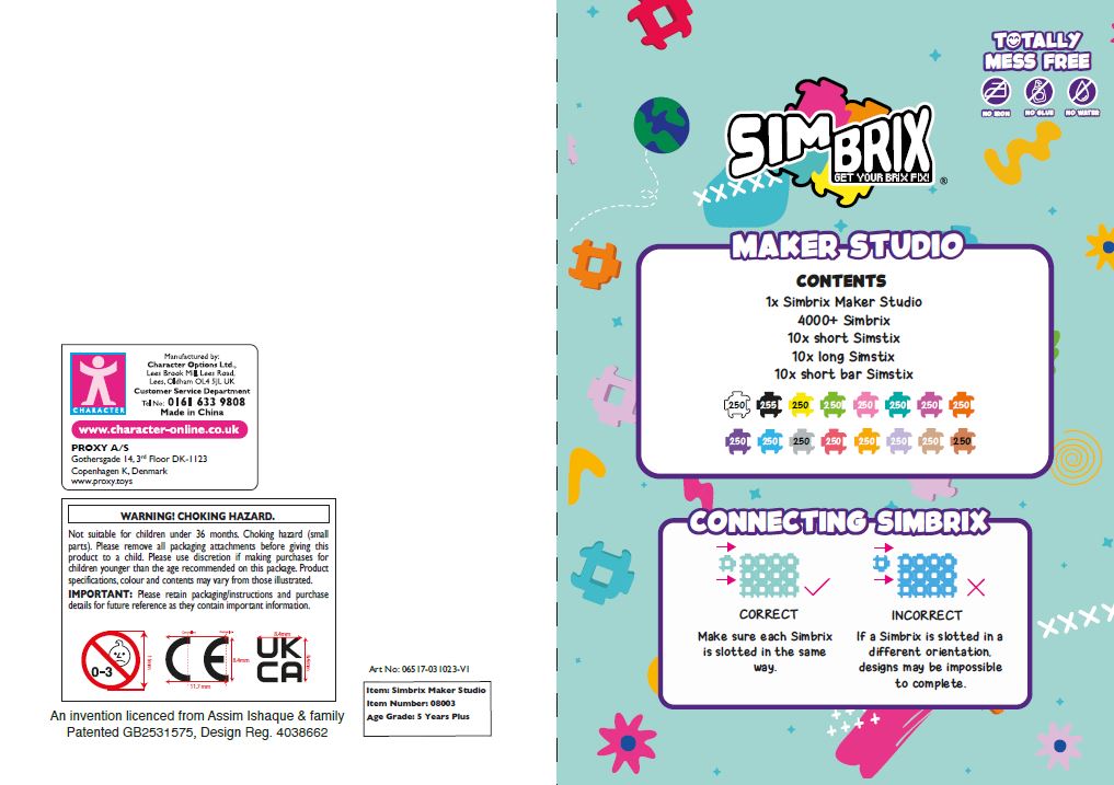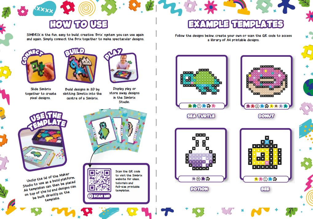 Create unique colourful designs with the all in one Simbrix Maker Studio. The Maker Studio features one tray with sorting compartments for 4000 Simbrix. Includes 16 colours of Simbrix and 30 Simstix. The easy to unclip lid also doubles as a build platform. Follow the templates available in the instructions book or visit the Simbrix website to download full scale templates. Or come up with your very own creations! With the Simbrix Studio the possibilities are endless!